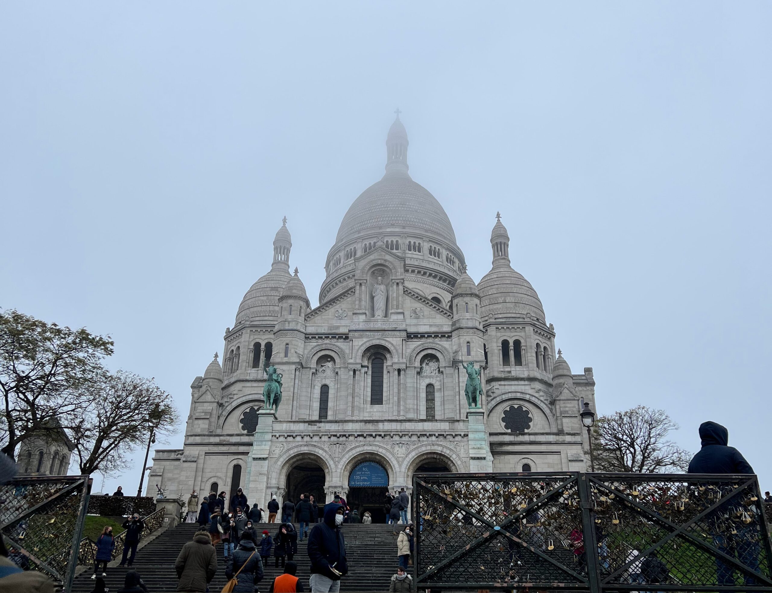 頂点を曇り空に飲み込まれたサクレ・クール寺院@モンマルトルの丘