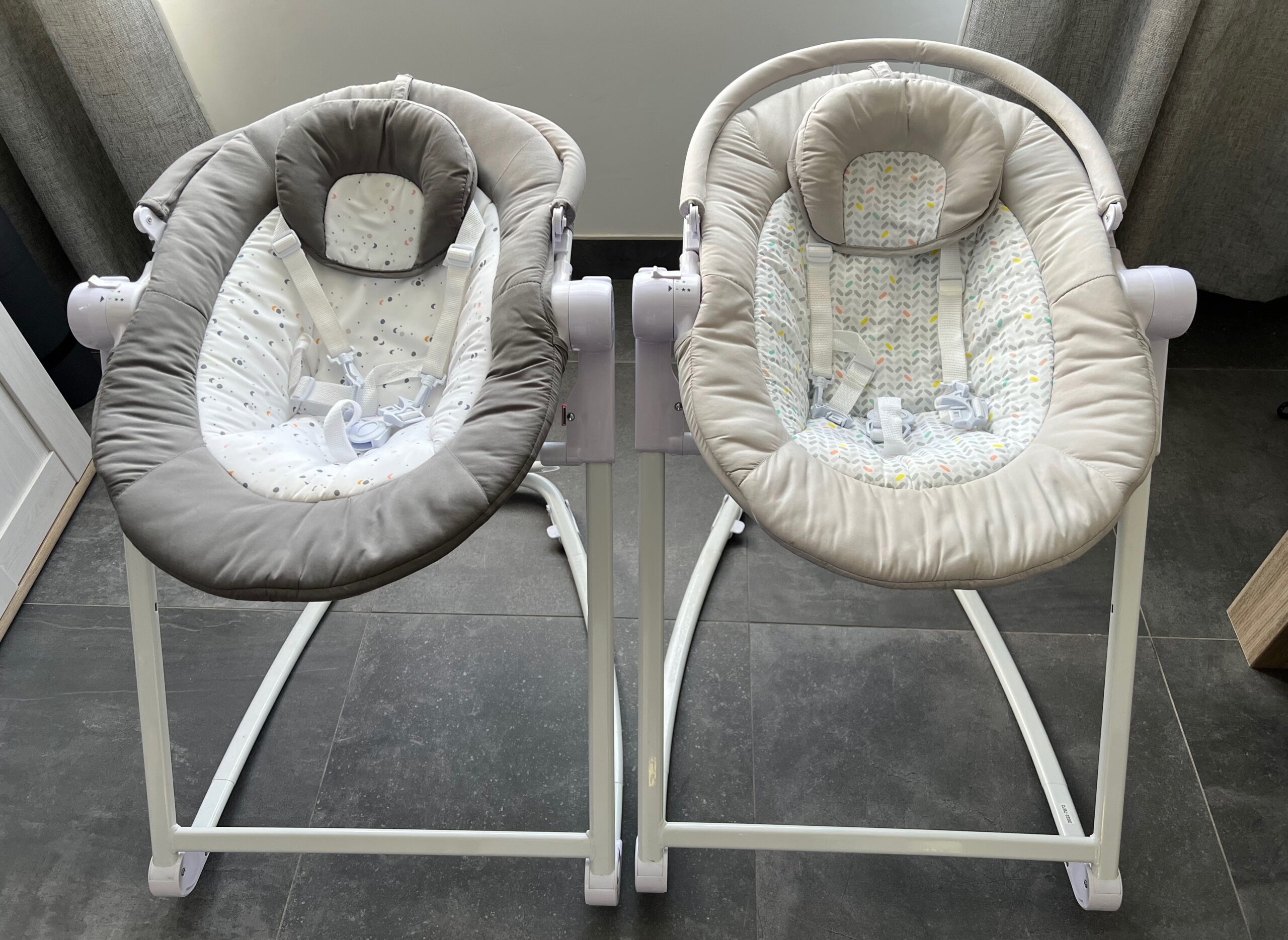 首がだんだんとしっかりしてくる生後2か月ぐらいから本当によく使いました。はじめはミルクを飲んだ後椅子を足でゆらゆらさせると、すぐに寝てくれて助かりました。知り合いからBabymoovの自動でスウィングするタイプの椅子もお古でもらったのですが、娘たちは断然こちらの椅子が好みのようでした。自動にはない不規則な揺れがよかったのかな。